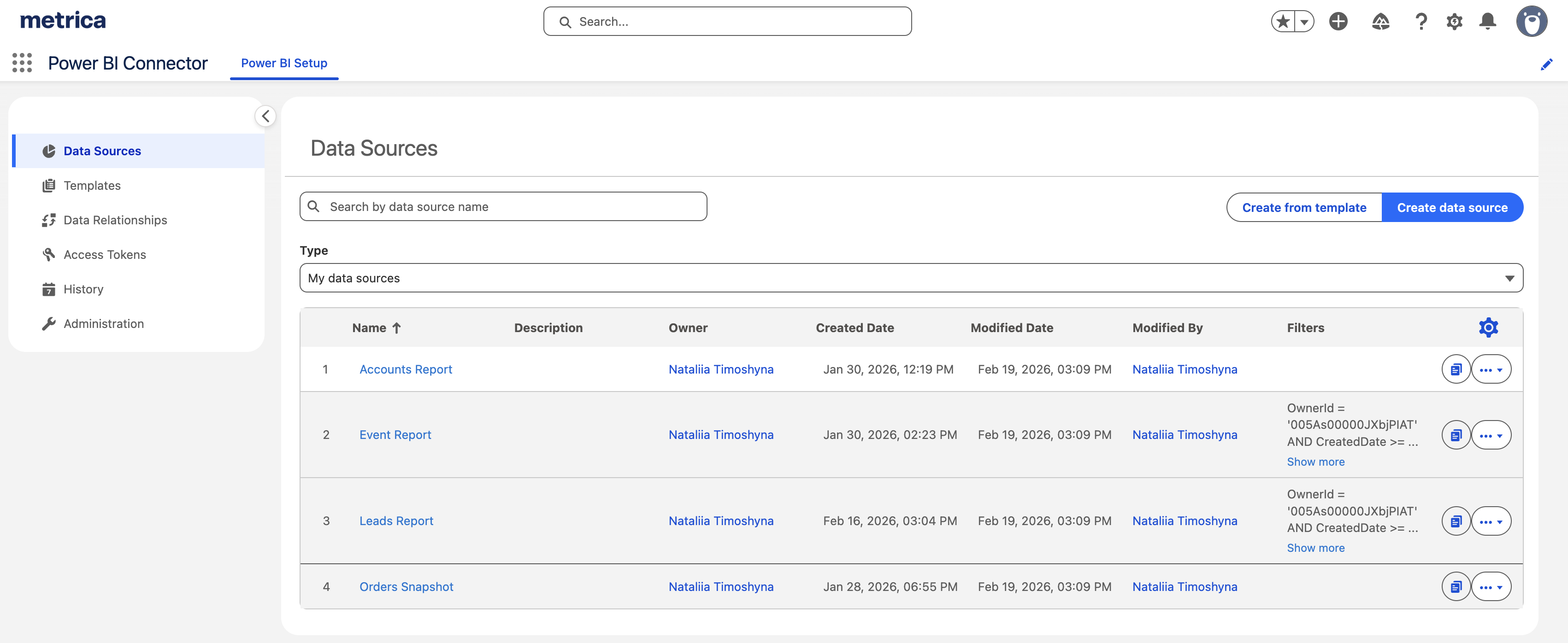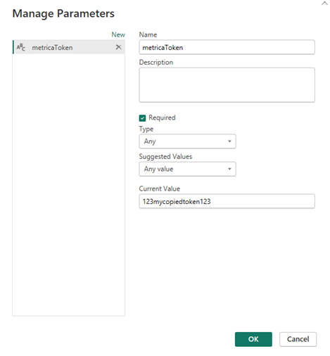 (Example: https://your-instance.my.salesforce-sites.com) - metricaToken is the parameter you will create in Power BI Desktop