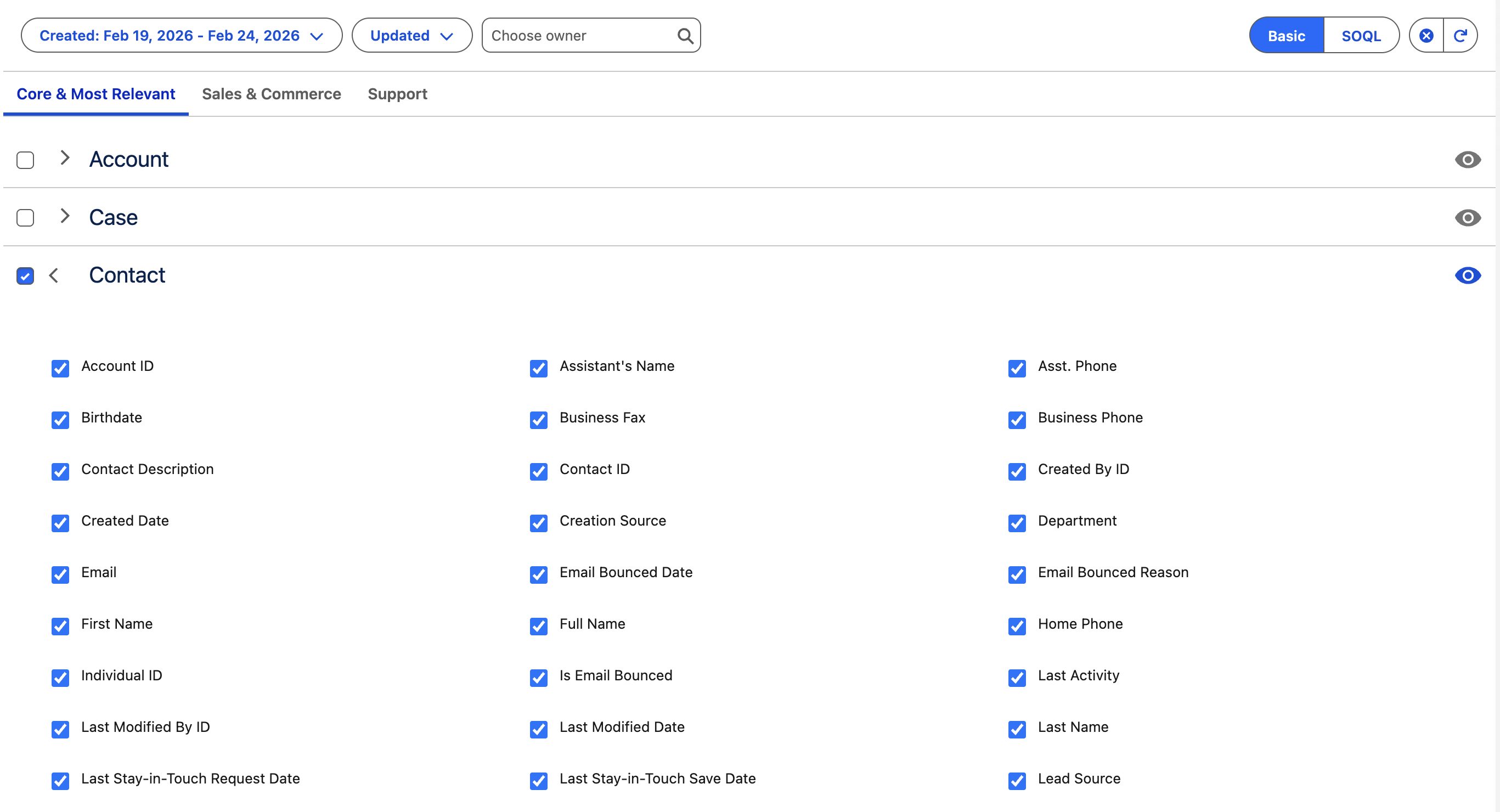 - Find the Salesforce object you want to export (e.g., Account, Contact, Case).