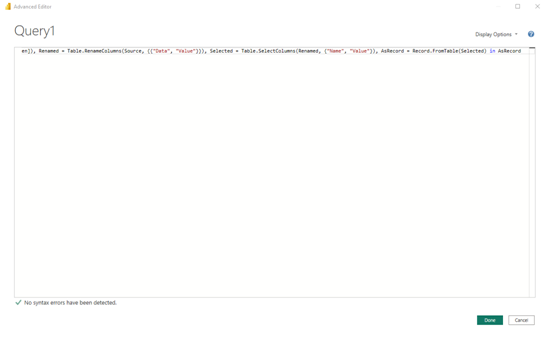 Selected = Table.SelectColumns(Renamed, {"Name", "Value"}),