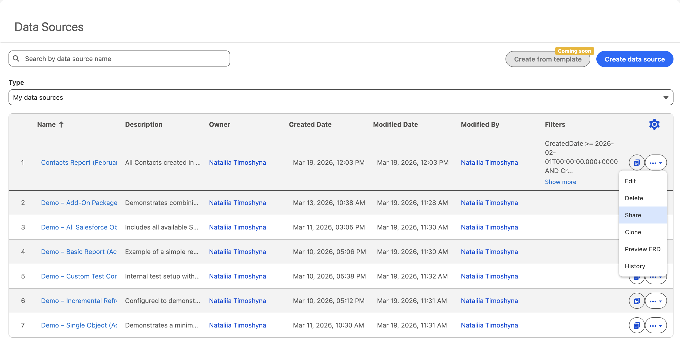 Go to Data Sources, click the ⋯ (three dots) next to a data source, and select Share.