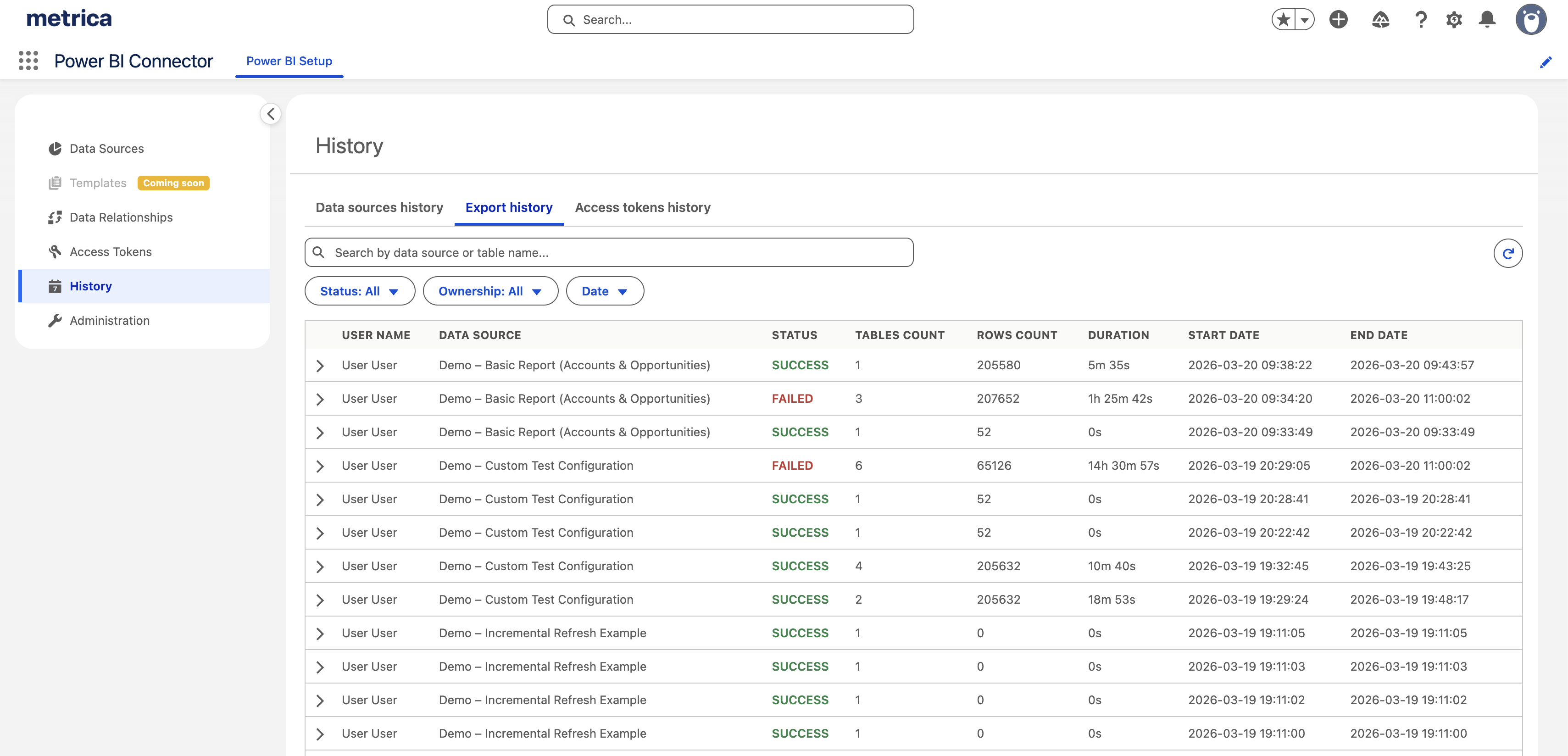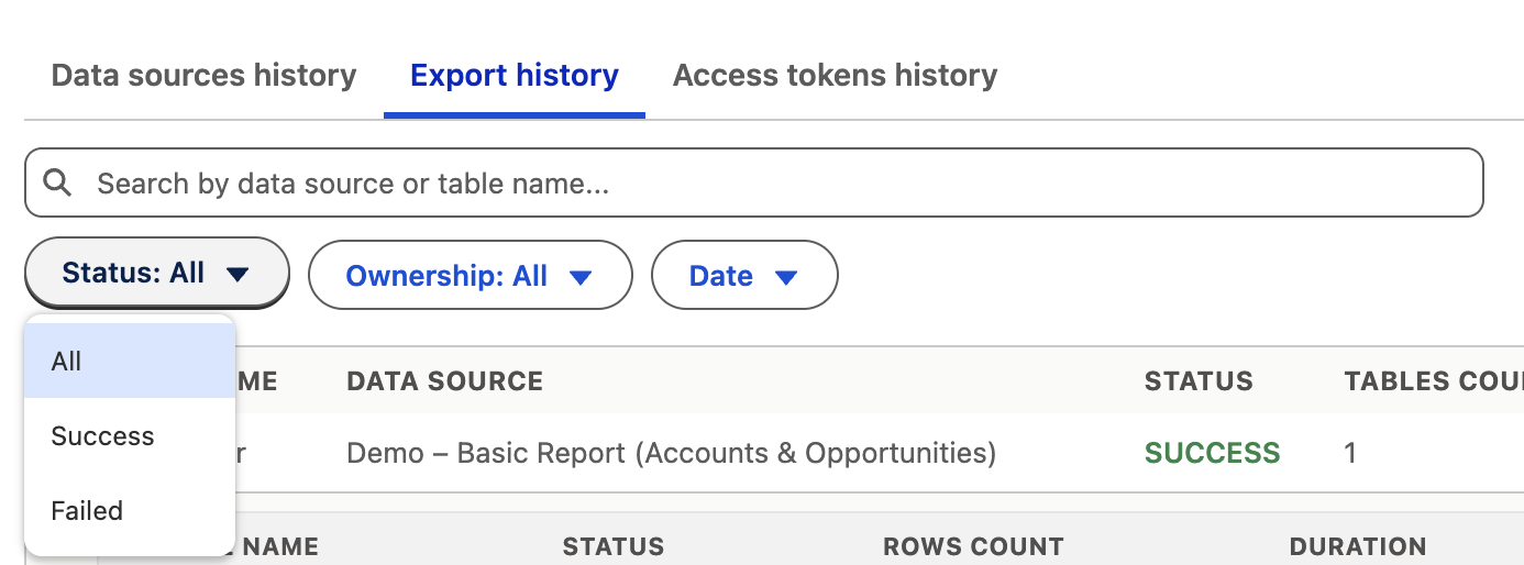 Export history helps you track all data exports to Power BI, including their status, duration, and details per table.